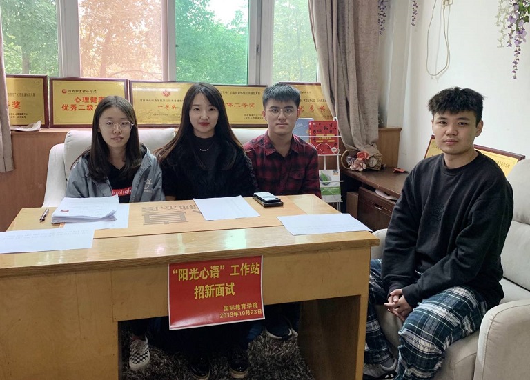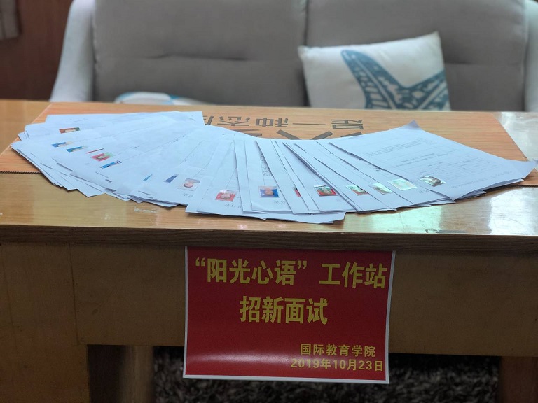 2019年10月23日中午一点beat365官方网站“阳光心语”工作站新一轮招新面试活动于行政楼311教室召开。阳光心语工作站站长丁玮老师以及工作站负责人郭猛、李垲熠、李珂均出席了本次面试并担任面试官。本次招新是为了给工作站注入“新鲜血液”,为同学们提供一个更广阔的学习空间,一个了解并热爱上心理的平台。