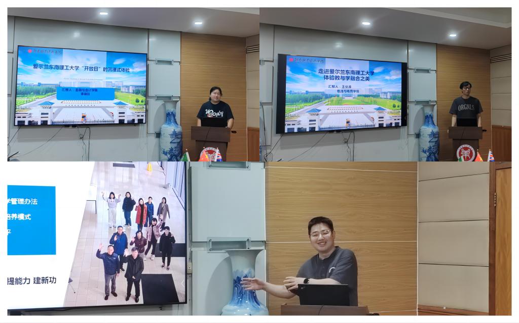 活动伊始,爱尔兰研修团队的李艳玲、王俊涛、刘天宇三位教师通过精美的PPT、生动的语言向各位教师阐述了他们在爱尔兰研修学习的过程;并根据他们在爱尔兰研修期间参与实践学习、观摩交流和深刻的研究反思,各自分享了他们在爱尔兰研修期间的所学所得;详细介绍在语言教学、国际教学理念、AI辅助教学、学生评价过程、教学资源运用和育人实践等方面获得的经验。