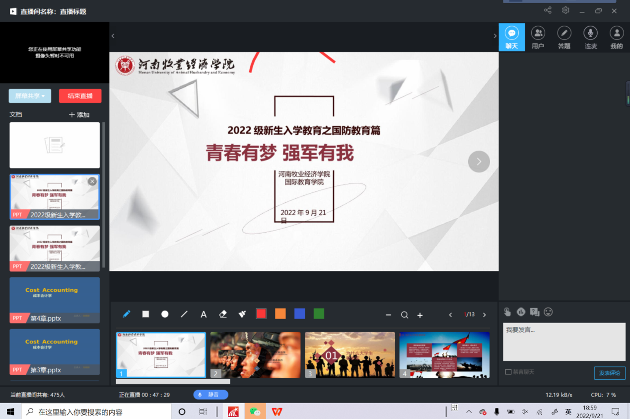 古之立大事者,不惟有超世之才,亦必有坚韧不拔之志。为加强新生国防教育观念,强健学生体魄,使国防教育常态化,培育国防后备人才,9月21日晚上,beat365官方网站组织全体2022级新生开展了以“青春有梦,强军有我”为主题的线上国防教育。本次国防教育专题讲座由刘颖颖老师主讲。