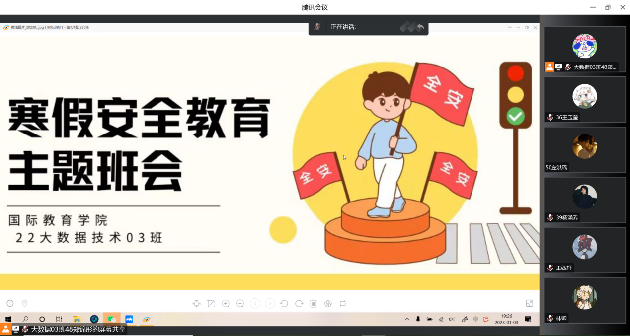会上,各班辅导员强调每个人是自身安全健康的第一责任人。一是疫情安全。疫情时代,病毒活跃,传播速度快,因此在寒假期间一定要注意个人防护,做好戴口罩、勤洗手、常通风、不聚集,保持安全社交距离等个人防护。二是严防诈骗。老师们结合近期高校网络诈骗和非法传销等案件,让学生详细了解受骗方式,提醒同学们要注意个人信息的保护,识别并防范网络诈骗等陷阱,牢记“心中无贪念,骗局远身边”。三是交通安全。春节期间是走访亲友的高峰期,也是各类交通安全事故多发期,外出一定要遵守交通规则,注意行车、乘车安全,做到文明行车。四是用电防火安全。冬天天气干燥,要养成良好的生活行为习惯,管理好“小太阳”等取暖设备,切忌在人多杂物多的地方燃放烟花爆竹,为家人和自身筑建安全的生活环境。最后,老师们提醒同学们要做好假期规划,合理安排学习,积极参加家乡抗疫防疫志愿服务工作和社会实践活动,让自己度过一个充实而有意义的假期。