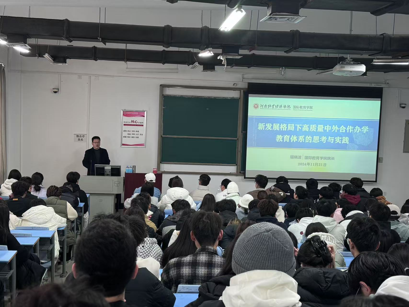 为帮助学生全面了解学校中外合作办学项目,提前规划未来发展路径,进一步增强爱校爱院意识,11月28日下午,beat365官方网站院长胡晓波以《新发展格局下高质量中外合作办学教育体系的思考与实践》为题,分别于和英才校区学术报告厅和龙子湖校区合100教室为2024级新生作专题报告。