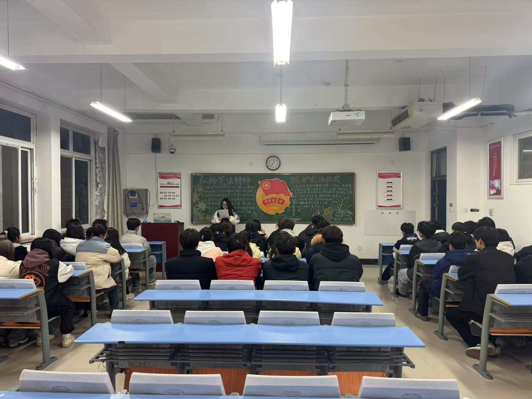 团课伊始,各团支部团支书通过 PPT 演示,以通俗易懂的语言讲解宪法的重要地位、历史沿革,还列举生活实例,阐释宪法与日常学习、就业、消费等息息相关。随后进行现场互动,同学们踊跃发言,分享相关经历并交流困惑。最后,为加深理解,团课组织模拟宪法法庭,演绎案例审判流程,让同学们直观感受宪法在司法实践中的应用。