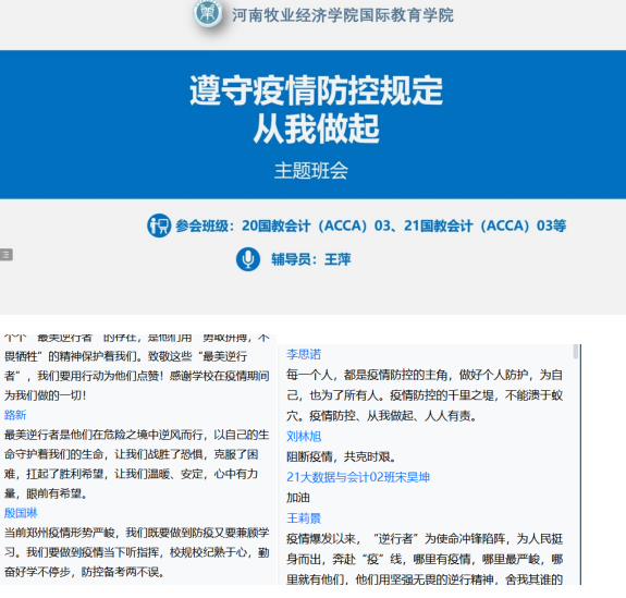 为进一步加强疫情防控期间学生教育管理,切实教育引导学生深刻理解学校关于疫情防控的各项举措,认真执行学校关于疫情防控的各项规定,加强自我约束,10月28日晚9点,国际教育学院第一时间安排部署,在全院范围内开展了“遵守防控规定,从我做起”线上主题教育活动,院党委书记贾江、院团委书记张丽、院团委副书记侯丁琳和何季霖、全体辅导员及4688名学生参加,会议由院党委副书记李江红主持。