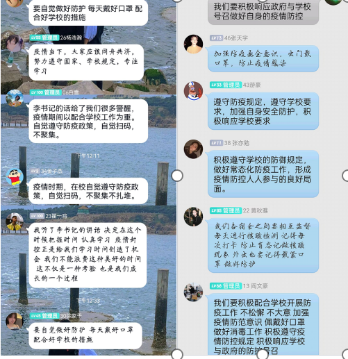 为进一步加强疫情防控宣传教育,做到政策知晓全覆盖,10月29日,各班辅导员又陆续召开了线上主题班会,引导学生正确认识疫情,科学了解疫情,服从学校的防控工作安排,遵守校规校纪,遇到困难,第一时间联系辅导员。鼓励大家互帮互助,互相理解、互相包容,众志成城,共克时艰,共同打赢疫情防控阻击战。会议结束后,各班级组建了疫情防控小组,要求寝室长带头执行,守好“责任田”,每日排查宿舍成员生活中存在的安全隐患,积极关注学生身体、心理状况,将不稳定因素及时反馈给老师,切实推动学院安全稳定工作落实落细。