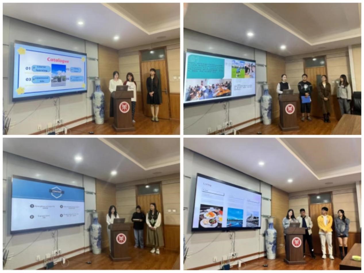 会上,带队老师首先介绍了此次暑期游学活动的基本情况,并对学习成果做了总结汇报,随后游学学生分为4组,分别从人文地理、生活习惯、基础设施、社交体育等多方面向大家详细介绍了爱尔兰游学过程中的亲身感受,并将个人观察到的中爱文化差异、成长感悟、学习收获等与与会领导老师进行分享。同学们的精彩分享让在场的来宾沉浸在了一段美好而又难忘的游学经历中,一帧帧、一幅幅精美的照片、珍贵的视频,不仅参加活动的学生重温了美好、感动不已;参会的领导老师也被深深吸引,纷纷肯定了此次游学活动的成效,对同学们的精彩展现表示欣慰。