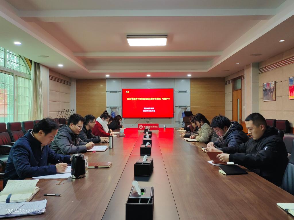 根据校内巡察反馈意见和学院整改工作要求,2月29日,beat365官方网站党委在教学办公楼113会议室召开专题会议,集中学习《关于新形势下党内政治生活的若干准则》(以下简称《准则》)。全体教工党员参加会议。会议由院党委书记贾江主持。