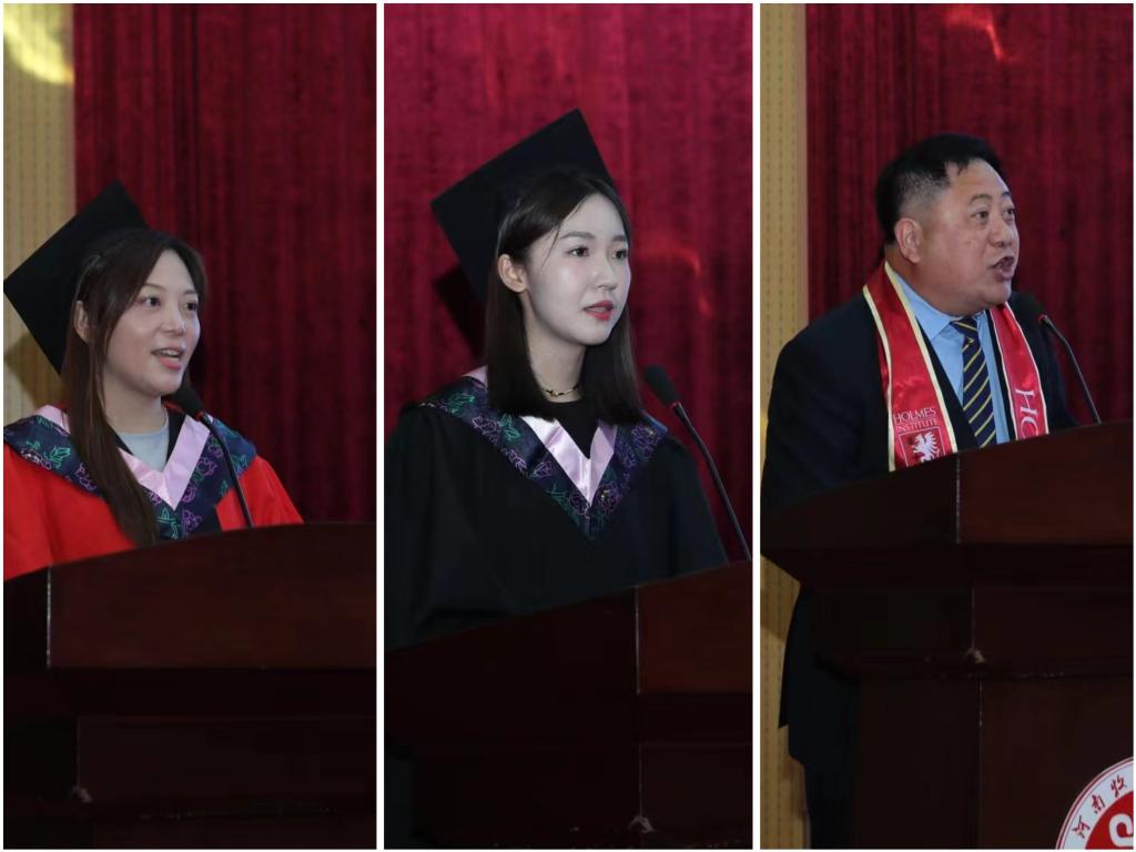 中方教师代表杨萌和澳方教师代表骆德明分别发言。他们向同学们顺利毕业表示祝贺,并寄语同学们面向未来,要心存善良、志存高远,不断丰富自己的知识和技能,努力成为勇往直前的先行者和引领者。