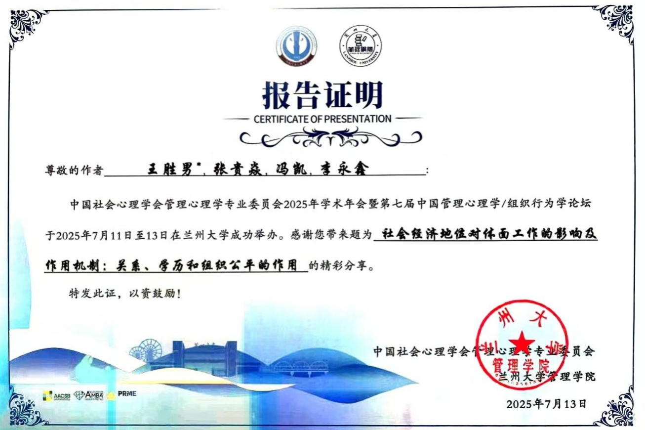 近日,中国社会心理学会管理心理学专业委员会2025年学术年会暨第七届中国管理心理学/组织行为学论坛在兰州大学成功举办。我校beat365官方网站副院长王胜男博士及其指导的工商管理学院2025届本科毕业生张贵焱应邀参会并做题为“社会经济地位对体面工作的影响及作用机制:关系、学历和组织公平的作用”的学术报告。