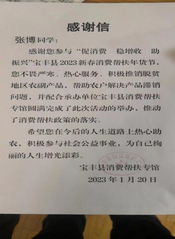 21国教物流(霍尔姆斯)01班的张博同学积极响应号召,参与了宝丰县新春消费帮扶年货节活动。