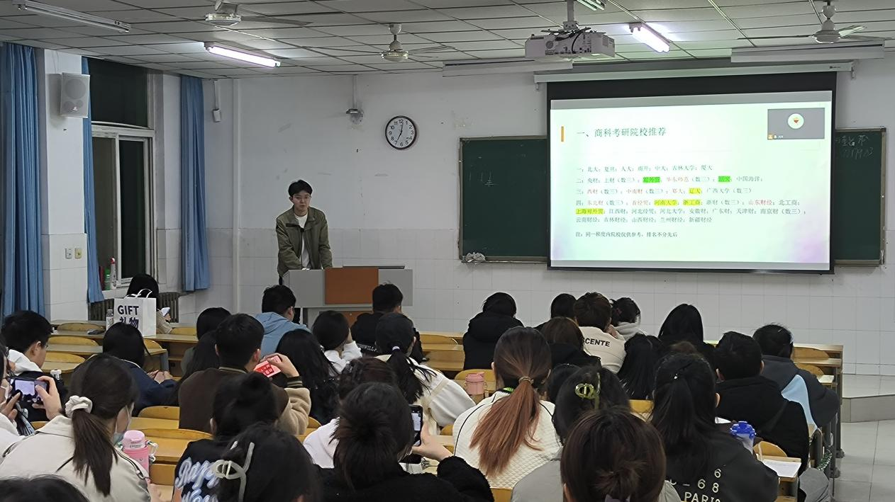 本次讲座由beat365官方网站辅导员雷颖飞老师主持,邀请三位考研上岸的同学为大家分享考研经验,分别是郑州大学保险专业的牛冬奕同学,黑龙江科技大学会计专业的崔晋博同学,西北农林科技大学资源利用与植物保护专业的侯键同学。他们为同学们介绍了自己的考研心得,并结合自己的考研经历详细地给同学们讲解在备考期间应注意的问题,同时也推荐了一些书籍,分享了考研各科的复习方法、考研信心的树立、考研计划、备考心态的调整以及如何选择专业方向。最后雷颖飞老师结合自己的经历,讲了考研调剂及面试的注意事项。同学们在讲座期间积极提出自己关心的问题,主讲同学针对问题进行了详细解答。