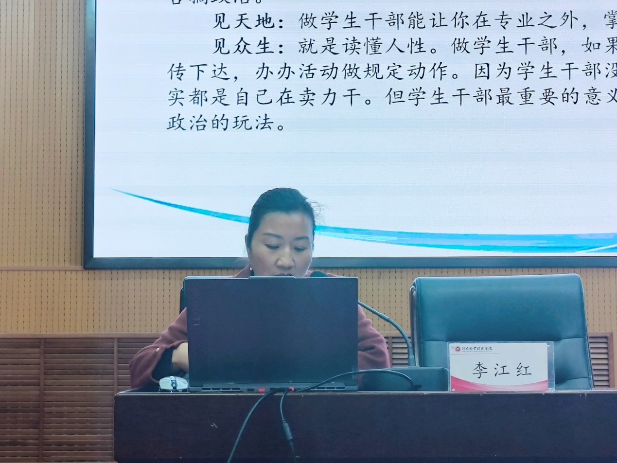 2023年11月20日,我院“青马工程”大学生骨干培训班暨学生干部素质能力提升培训班第一讲——《学生干部的学习与发展规划》专题报告在学术报告厅举行。本次报告由院党委副书记李江红担任主讲。