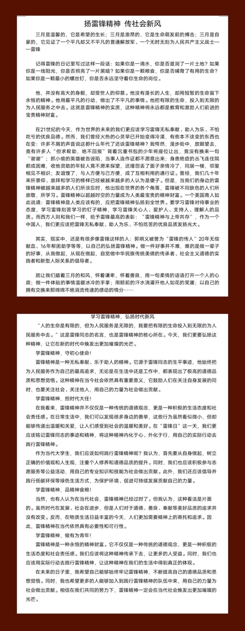 本次活动以“雷锋精神”为主题,为同学们提供了展现自我风采的平台,体现出青年学子积极向上、无私奉献的精神风貌。他们或是分享自己在生活中如何践行雷锋精神,或是探讨雷锋精神在当今社会的重要性和现实义,或是鼓励更多人学习和践行雷锋精神,积极参与社会公益活动,共同创造美好未来,充分展现了参赛者对雷锋精神的深刻理解和独特感悟。