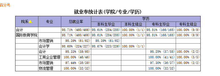 通过多方面的努力,我院2019年的就业率达到了学校预期的各阶段目标,2019年毕业生总数466人,就业人数385人,毕业生最终就业率(2019年9每2月)达到91%以上,年终就业率(2019年12月底)达到98%以上,毕业生就业质量较高,学生自主创业人数多。其中自主创业人数6人,银行18人,事业单位及国企20人,教师岗位应聘5人,就业统计工作真实、准确、有效,毕业生就业质量较高。