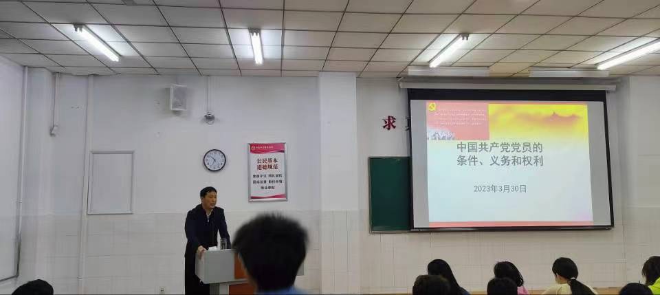 为严格党员发展工作程序,强化入党积极分子对党员条件、义务和权利等知识的了解,3月30日晚,beat365官方网站2023年第一期入党积极分子培训班第四讲《中国共产党党员的条件、义务和权利》专题党课在英才校区W210教室举行。本次党课由学院党政办公室主任刘超主讲。