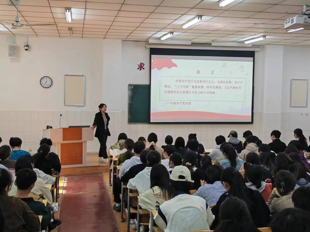 为进一步端正广大入党积极分子的入党动机,切实做好入党积极分子的培训教育工作,10月20日中午,beat365官方网站2023年第二期入党积极分子培训班第五讲《党的指导思想》专题党课在英才校区E209教室举行。本次党课由学生第三党支部组织委员王萍老师主讲。