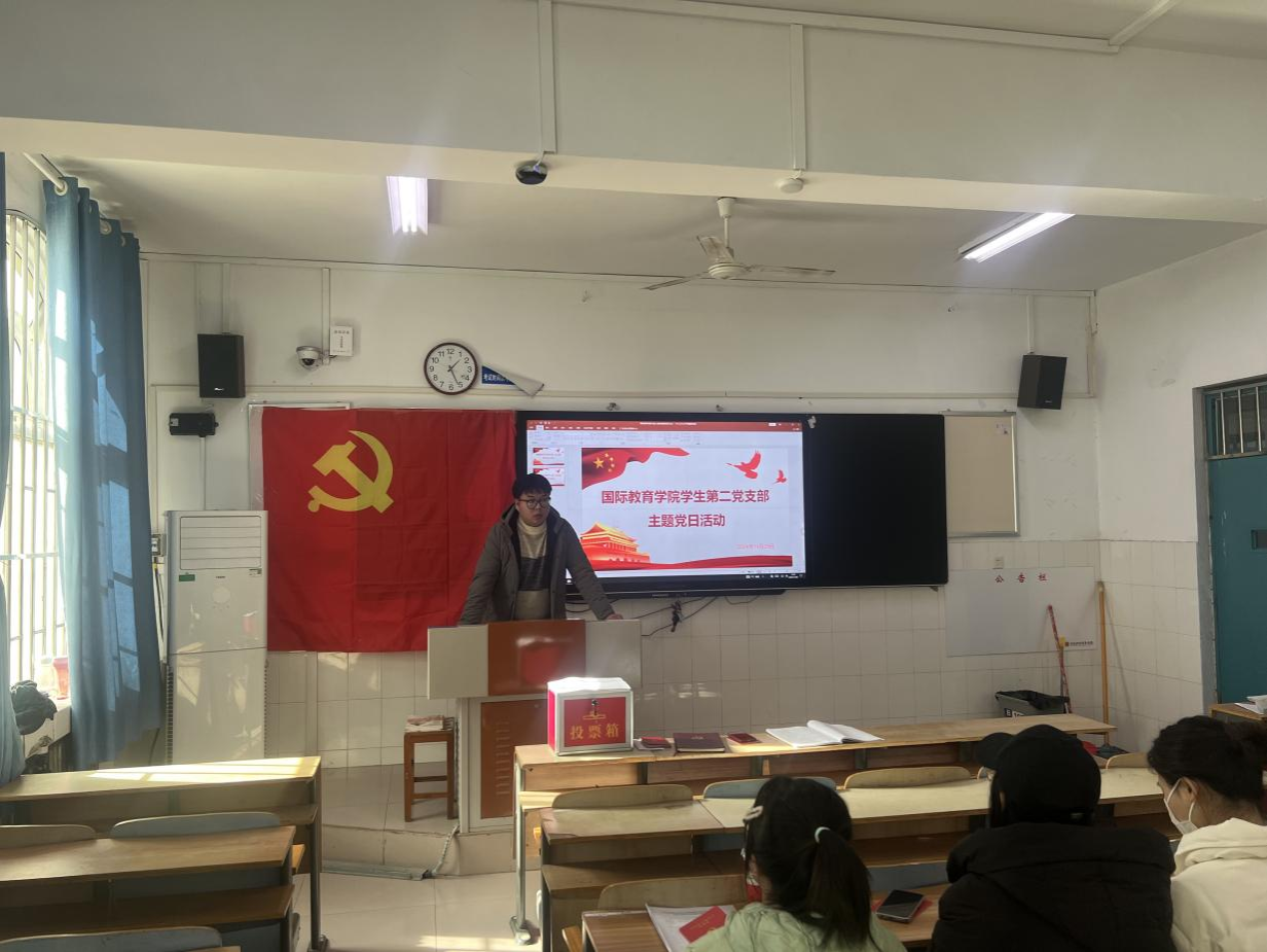 1129日中午,国际教育学院学生第二党支部在教学楼B107开展11月份主题党日活动,本次活动由学生第二党支部书记滑斌主持,支部全体党员参加。